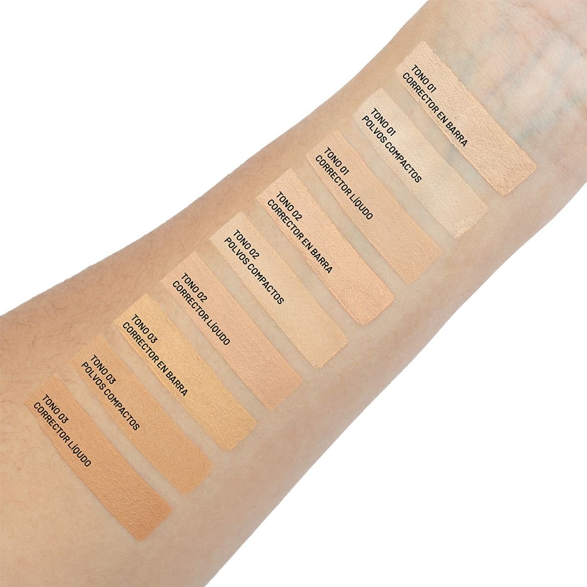 ncluye un corrector en barra de baja cobertura, perfecto para aportar puntos de luz y un acabado fresco; un corrector líquido de cobertura media, ideal para corregir y neutralizar ojeras e imperfecciones; y un polvo compacto que aporta color y ayuda a sellar los productos líquidos y en crema, prolongando su duración.